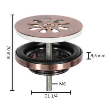 reng je fonteinset in je toiletruimte in één stijl met de afvoerpluggen van Differnz! De fonteinplug monteer je eenvoudig. De Differnz afvoerplug voor fontein rood koper heeft een diameter van 65 mm een hoogte van 70 mm en het schroefdraad heeft de maat M6. De afdichtingsringen voorkomen dat er lekkages ontstaan. Het messing materiaal heeft een rood koperen afwerking.