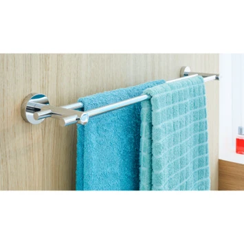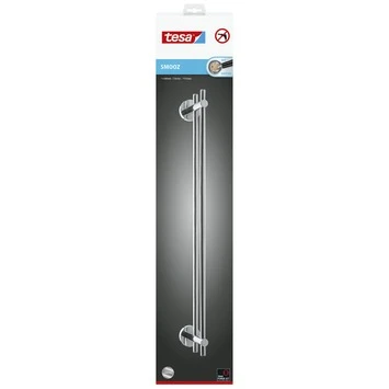 De tesa® Smooz dubbele handdoekhouder in hoogglans chroom is roestvrij en heeft een chique, tijdloos design. Deze houder voor handdoeken is geschikt voor het ophangen van 2 handdoeken. Hij is te bevestigen zonder boren dankzij de unieke tesa® Power.Kit technologie. Monteren is heel eenvoudig: 1) Plak de adapters op de muur en vul deze met de tesa® Power.Kit-lijm 2) Laat de lijm 12 uur uitharden 3) Schroef de handdoekhouder op beide adapters. Alle benodigde materialen zijn in de verpakking bijgesloten: handdoekhouder en adapterset. De houder is zonder lijmresten en beschadiging te verwijderen. Opnieuw gebruiken kan met de adapter set BK20-2, welke ook los te koop is. Geschikt voor tegels, metaal, natuursteen, marmer, beton, hout, glas en vele soorten kunststof. Niet geschikt voor behang, stucwerk en andere oppervlakken met een antikleeflaag. De Smooz serie bestaat uit diverse accessoires voor een complete look, bekijk ook eens de rest van het assortiment.